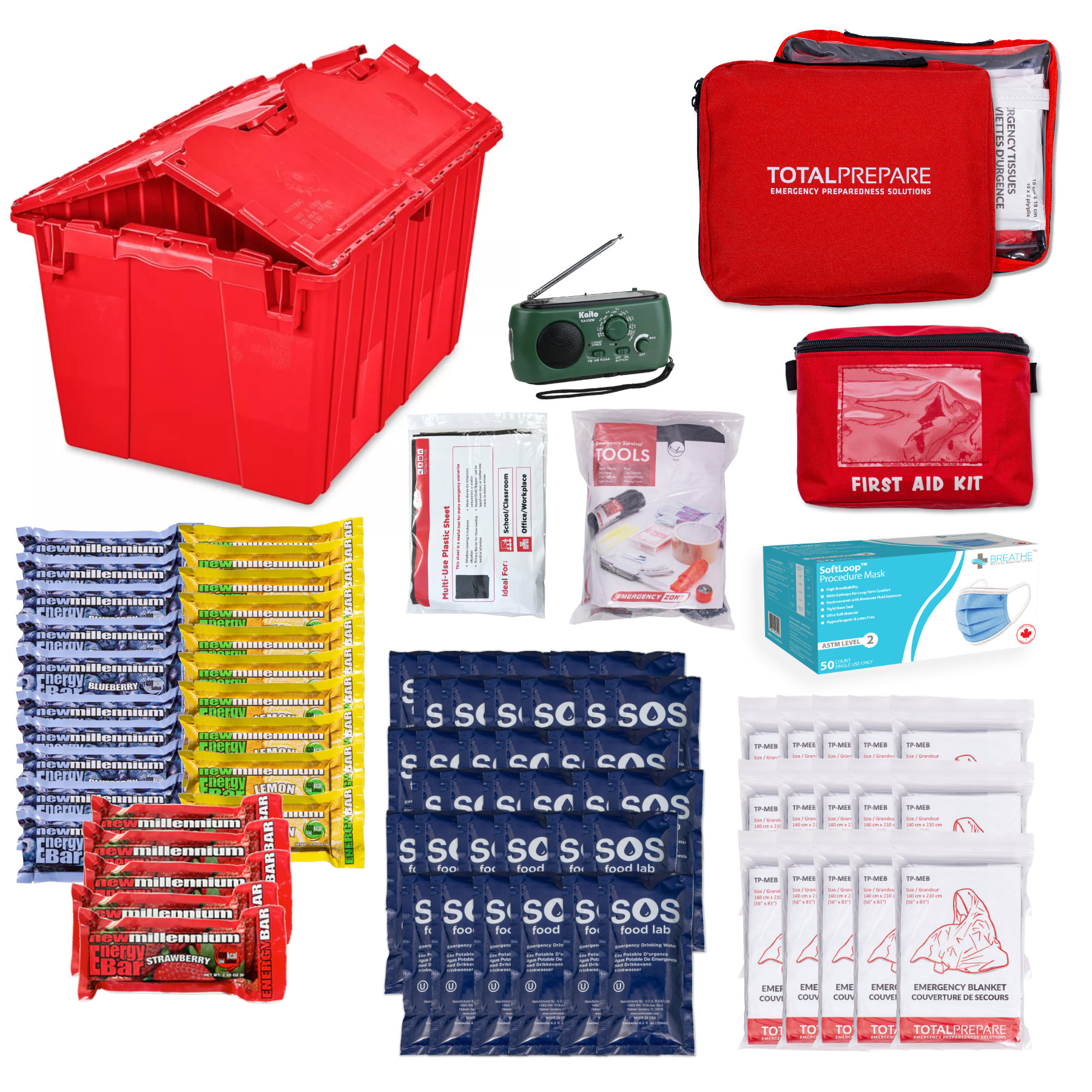 Includes a stackable plastic tote, Emergency Essentials Kit in nylon bag, five reusable table covers, one box of ASTM Level 3 masks, one EZ Tool Kit, one Essential First Aid Kit, twenty five reflective emergency mylar blankets, one solar crank weather radio with cell charger, twenty five SOS Millennium food bars, and thirty six SOS emergency drinking water pouches.Â