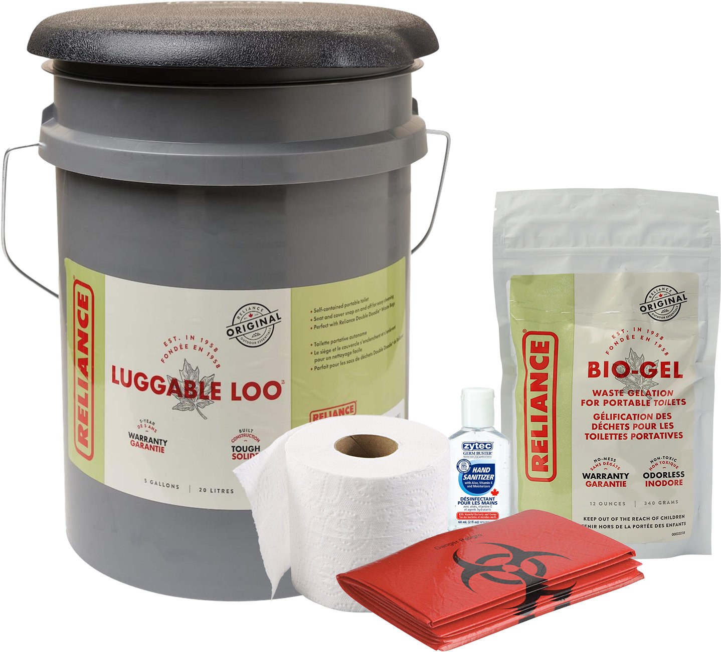 - Includes 5-gallon bucket with toilet seat, EcoGel waste treatment powder, toilet liners, biohazard bag, nitrile gloves, hand sanitizer and toilet paper.