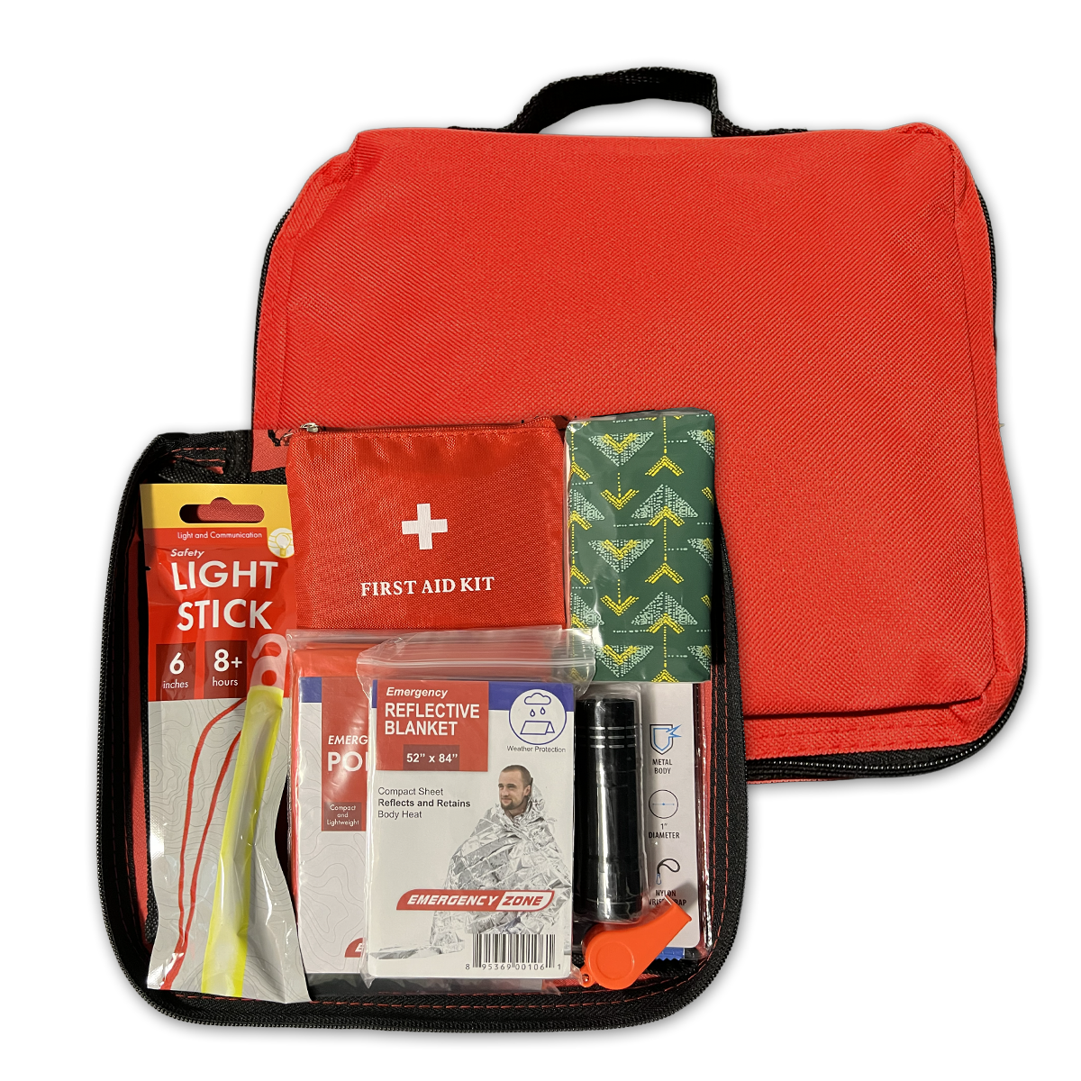 Be ready wherever life takes you with The Everywhere Kit — your all-in-one solution for unexpected moments at home, at work, or on the road. Designed for convenience and peace of mind, this compact kit includes essentials for light and communication (LED flashlight, lightstick, emergency whistle), shelter and sanitation (reflective blanket, poncho, tissue, and sanitation bags), and basic first aid (mini first aid kit, gloves, and a face mask).